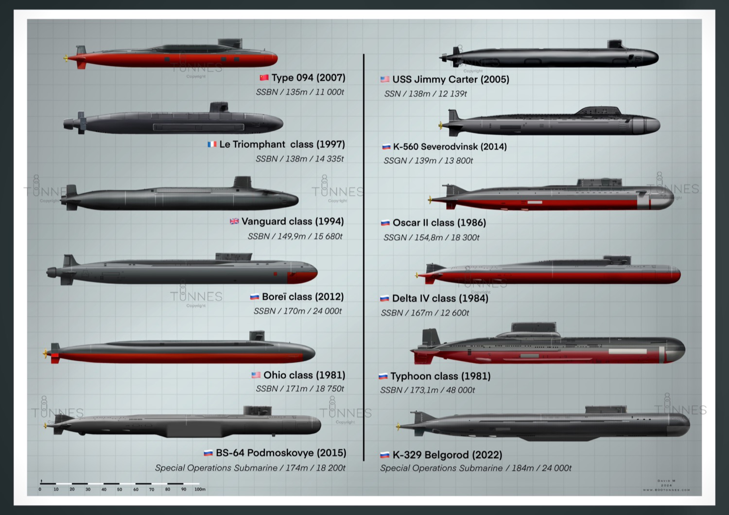 The Chinese Type 094, the SSBN class "Le Triomphant", the SSBN class "Vanguards", the American submarine "Jimmy Carter" and the "Ohio" class, as well as a long list of Russian SSBNs: Typhoon, Borei, Delta IV, the SSGN class Oscar II and the brand new Lassen class.