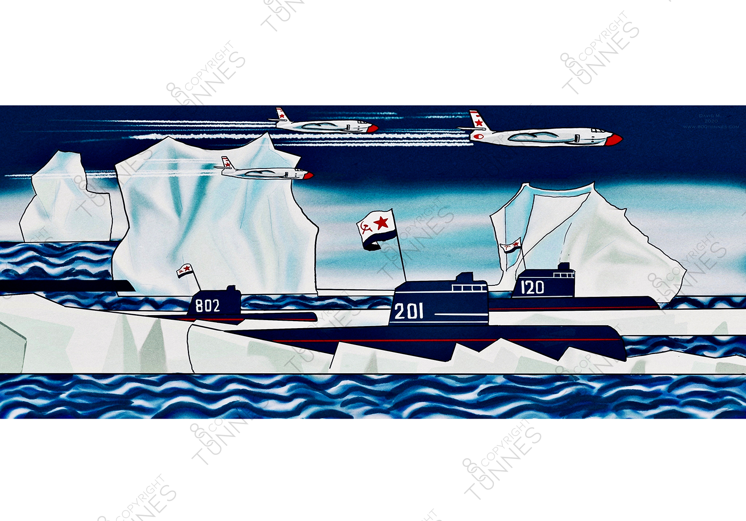 A digital drawing, vintage style, of Soviet submarines and planes inspired by the official painting of SEVMASH shipyard