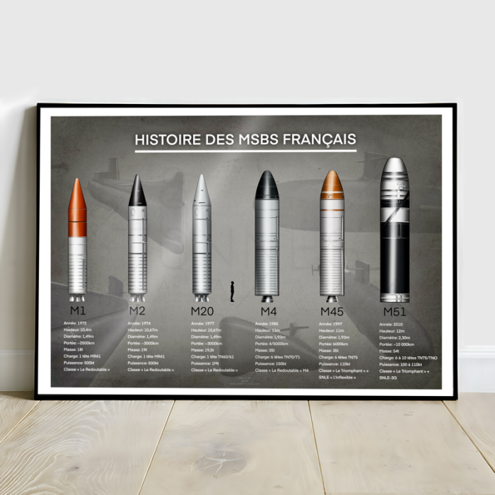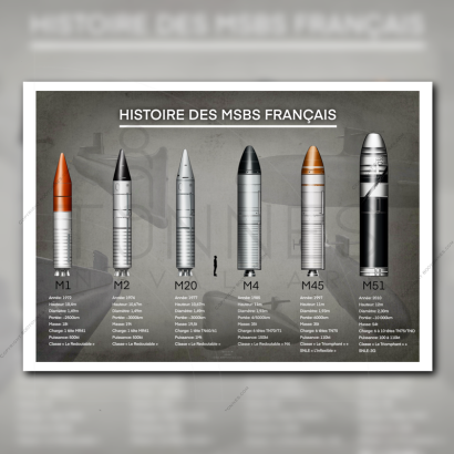 Du premier M1 testé sur le Gymnote, au M45 qui allait équiper les SNLE dans les années 90, et le dernier missiles actuellement en service, le M51 qui équipe les SNLE de classe "Le Triomphant", cette affiche résumé toutes les caractéristiques de chaque version, et sa représentation à l'échelle.