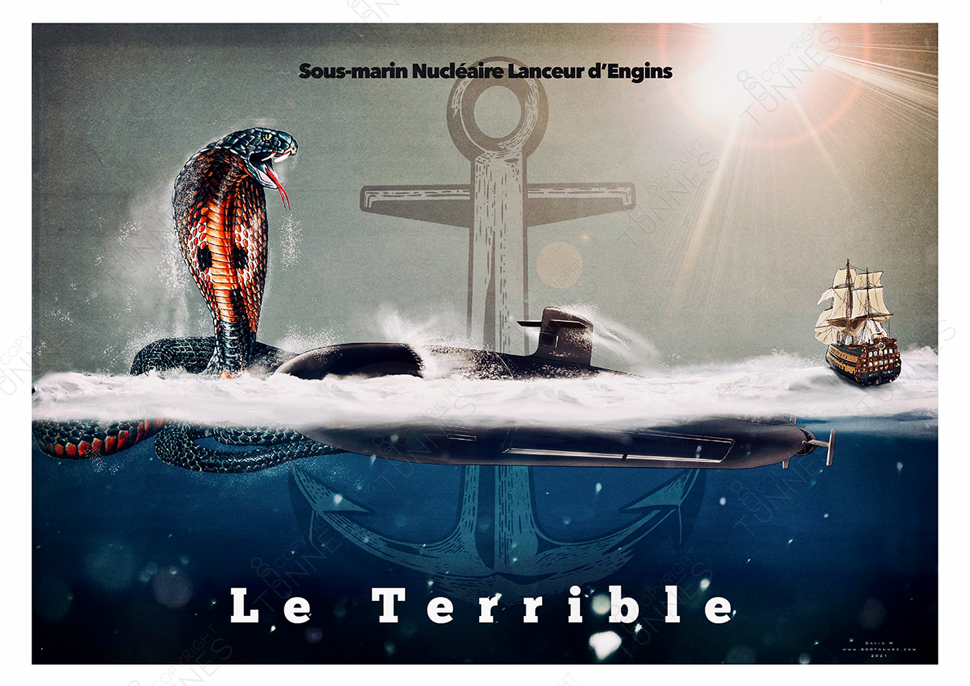 Le sous-marin représenté ici est le Terrible, dernier de la série. Cette affiche est directement inspirée de la tape de bouche officielle du bâtiment.