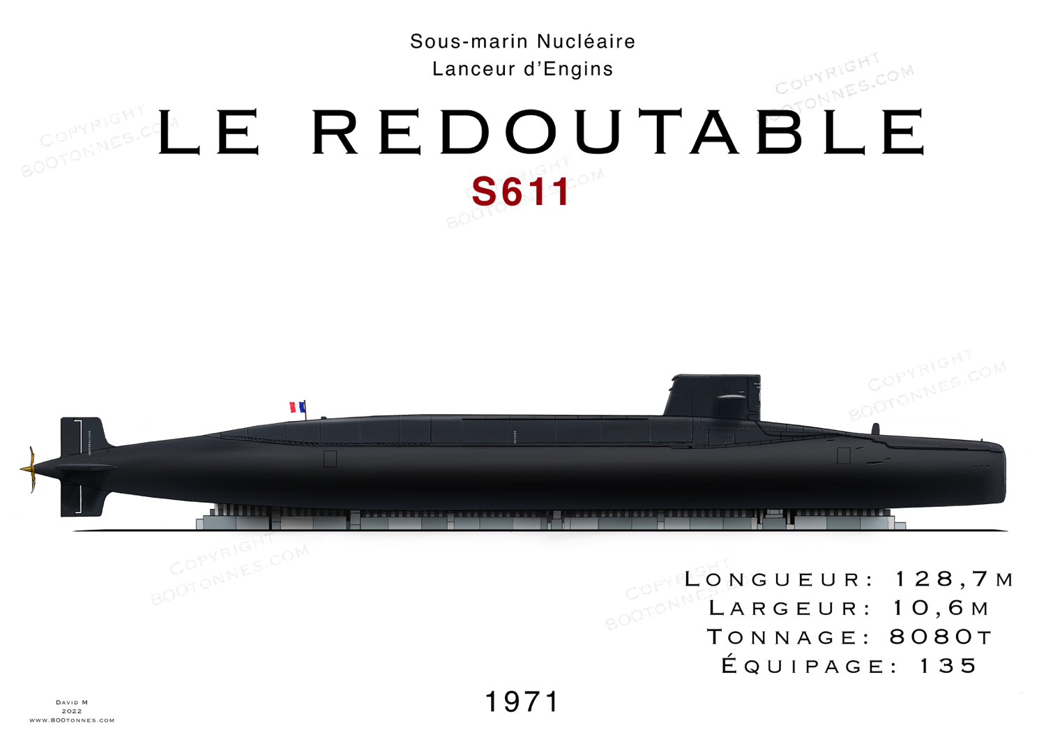 Long de 128 mètres pour 10,6 mètres de large, le SNLE embarque 16 missiles MSBS, remplacé dans la décennie suivante par des missiles M20 à la portée améliorée (et représentés sur cette affiche).