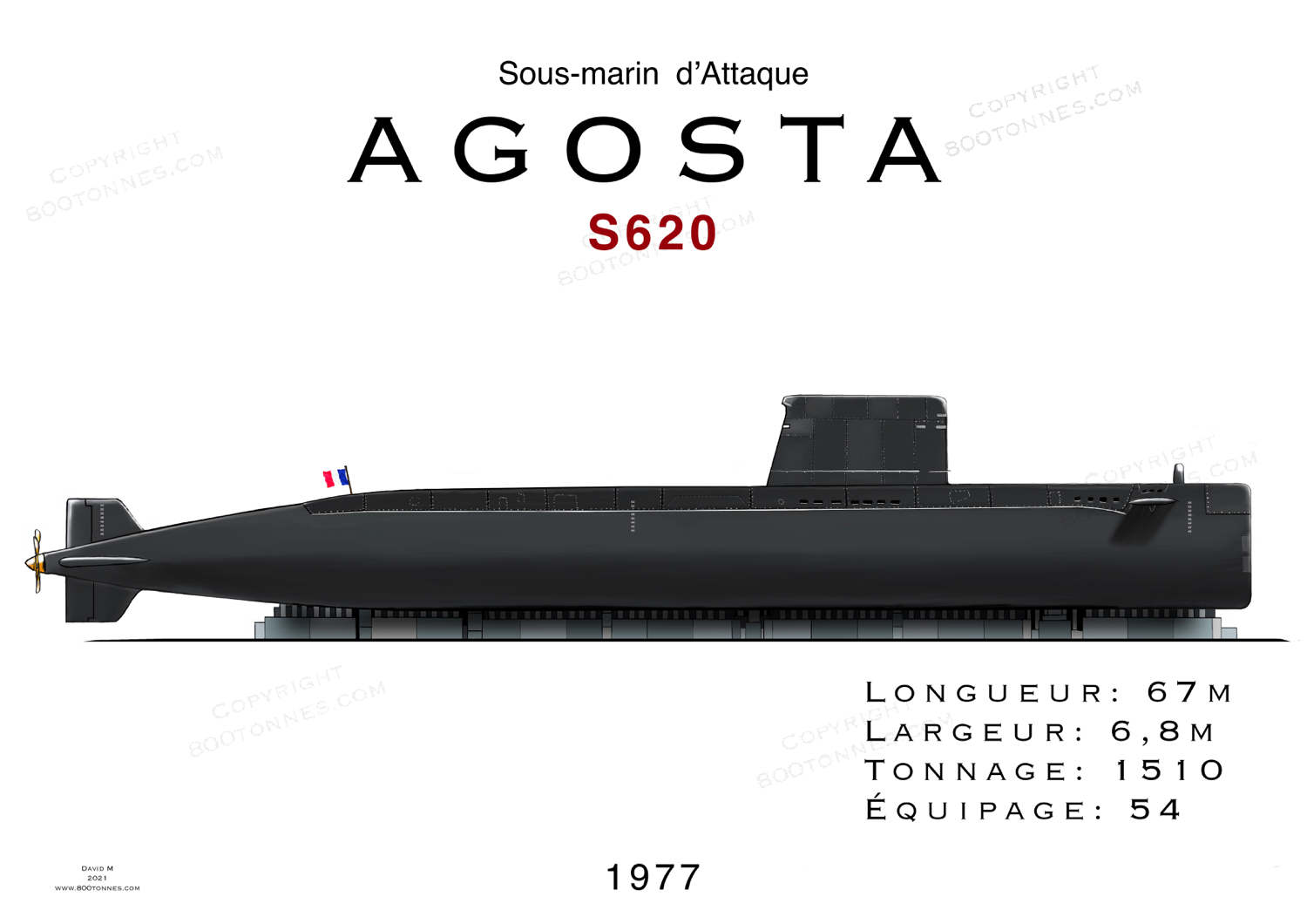 Long de 67 mètres pour 1500 tonnes, ces sous-marins offrent une grande polyvalence et une discretion acoustique extrême en propulsion électrique. Ils embarquent 54 hommes d'équipages, pour des missions à longues distances. Leur efficacité sera reconnues par différentes nations qui vont les adopter, en l'occurence le Pakistan et l'Espagne, qui profiteront d'une version améliorée et agrandie de 9 mètres (Agosta 90B).