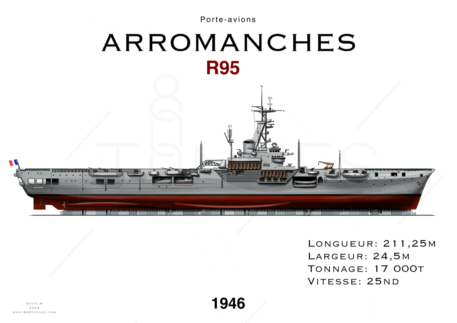 Une affiche représentant le profil du porte-avions R95 Arromanches