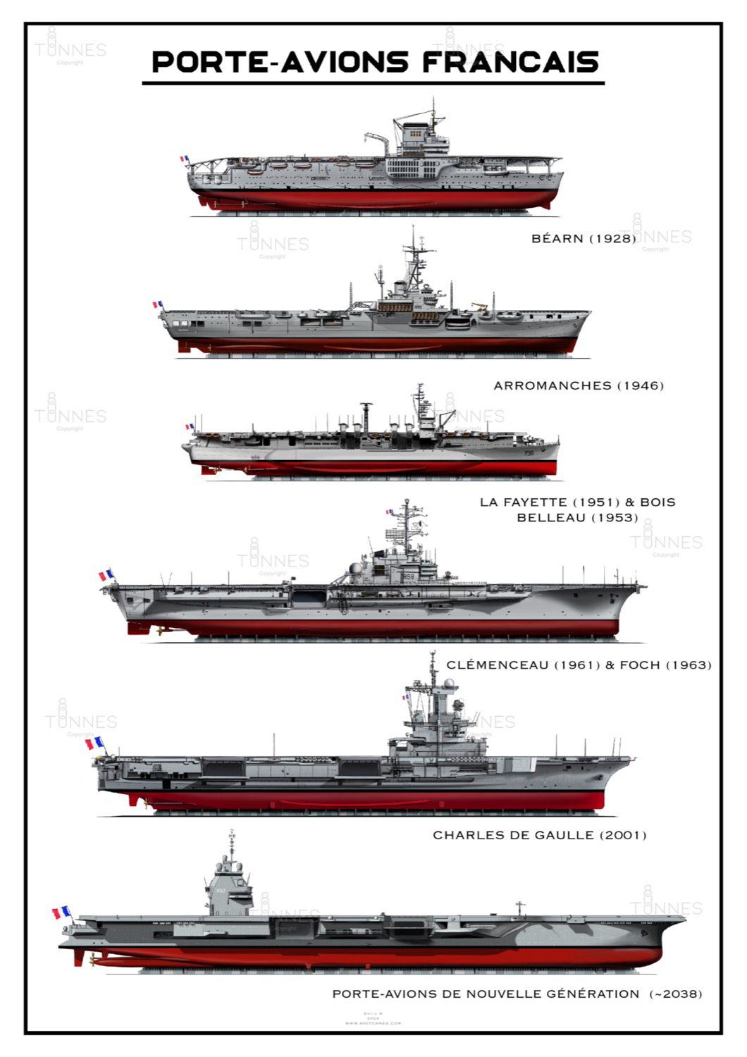 Une affiche Poster regroupant à l'échelle, l'ensemble des portes-avions français, du Béarn (1928) au futur PA-NG (2038)
